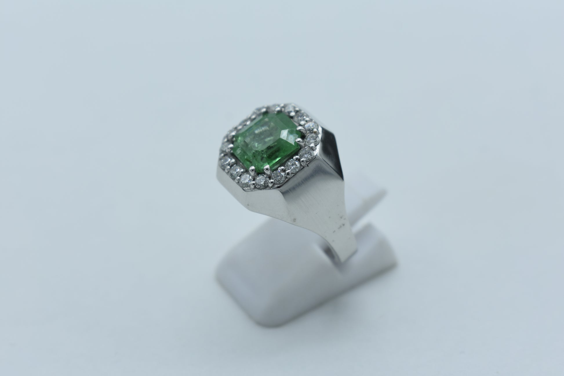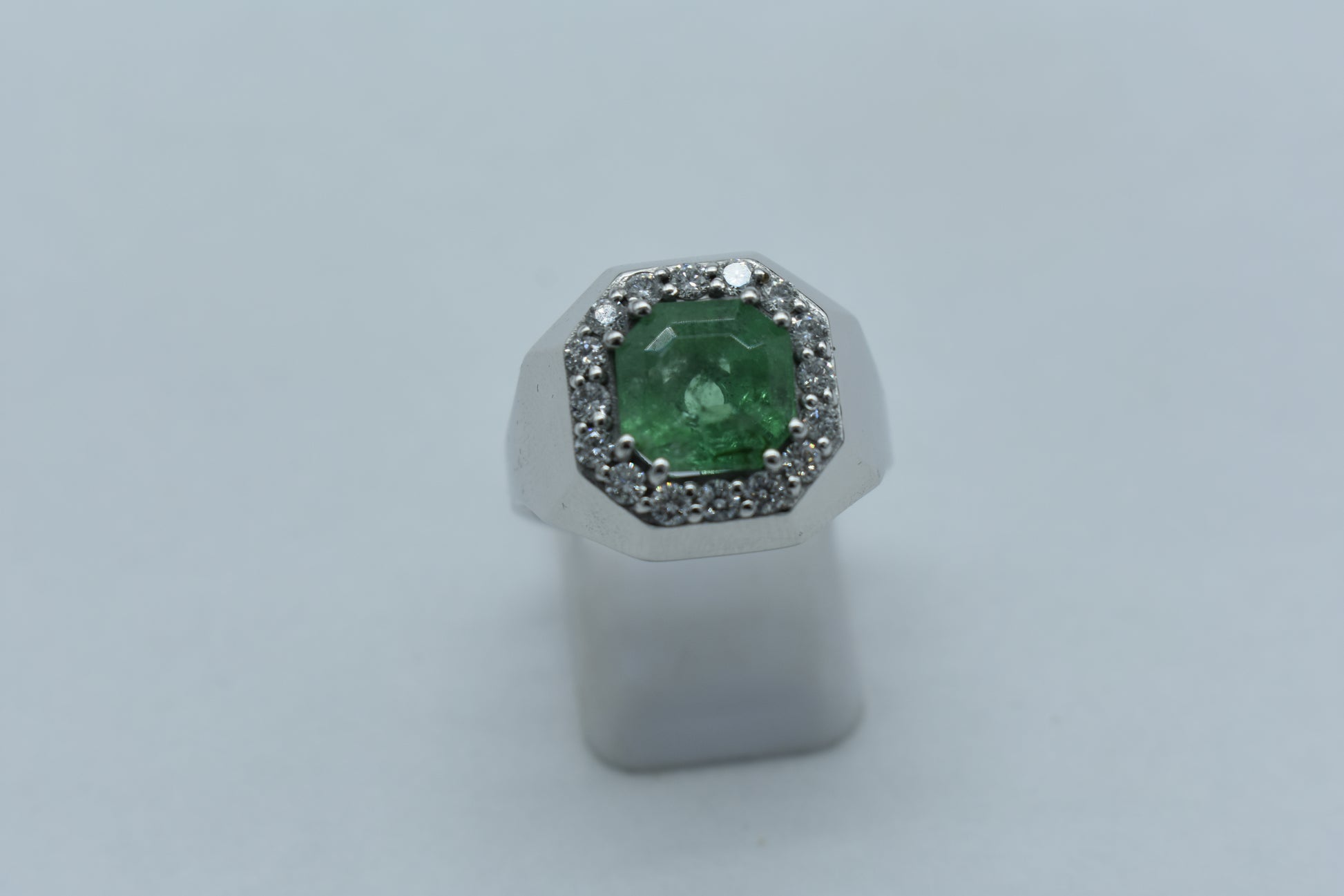 Anello di 8.10 grammi di oro bianco 750/1000 con 0.64 carati di diamanti e 3.33 carati di smeraldi
