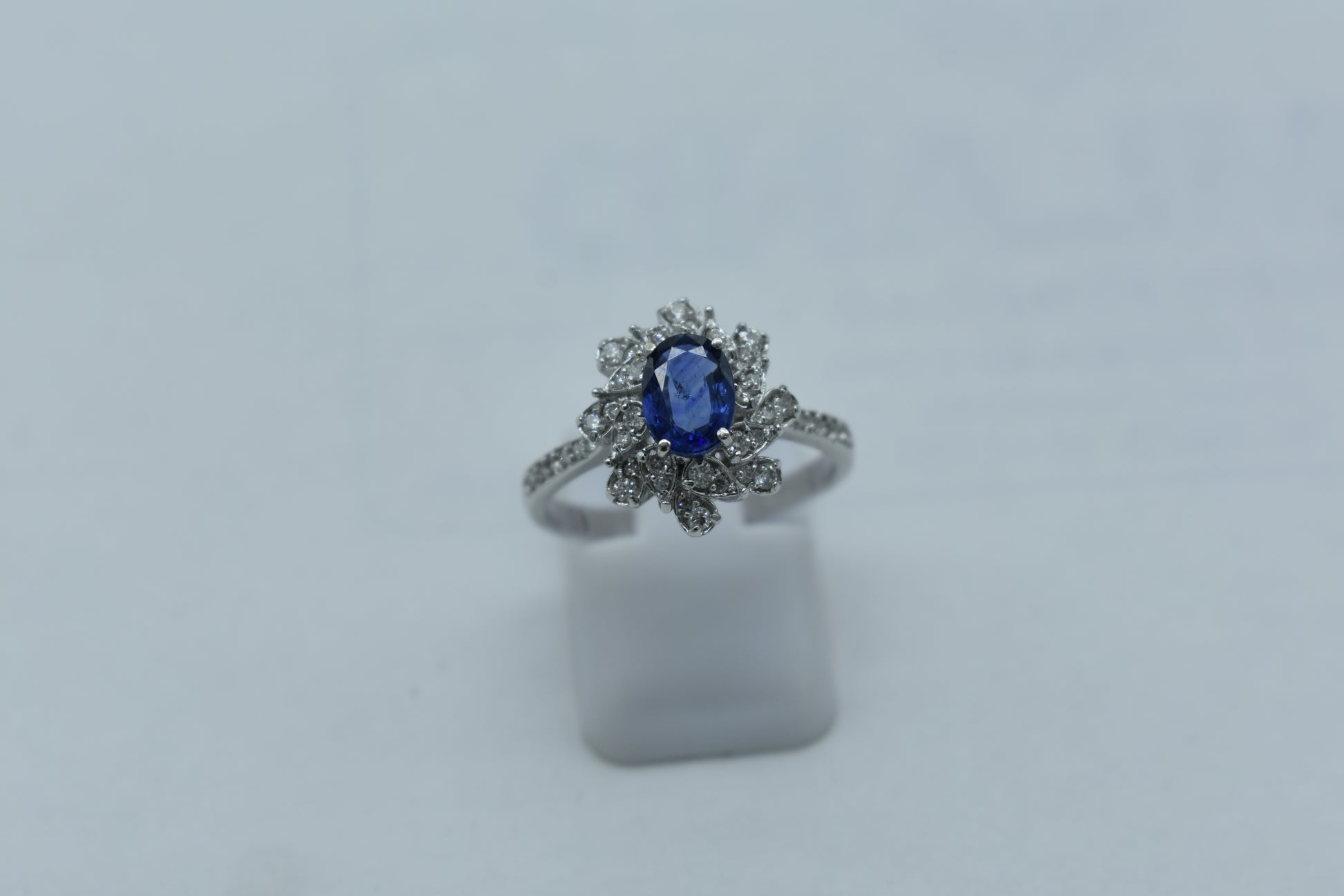 Anello di 3.60 grammi di oro bianco 750/1000 con 0.40 carati di diamanti e uno zaffiro di 1.02 carati. L'anello ha una misura di 14 cm