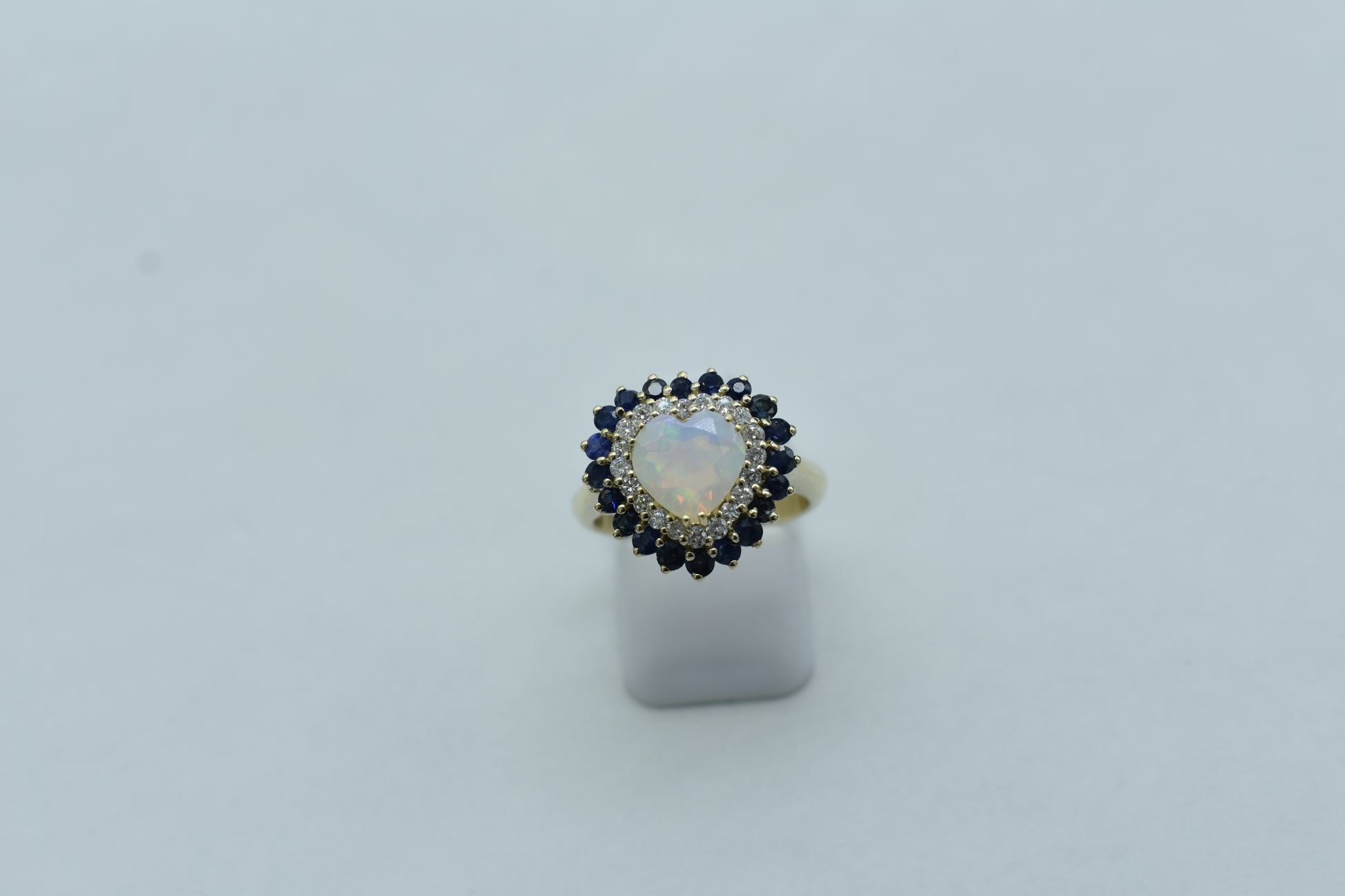 Anello di 6,50 grammi di oro giallo 375/1000 con 0,40 carati di diamanti, 1,06 zaffiri e opale centrale di 1,22 carati.