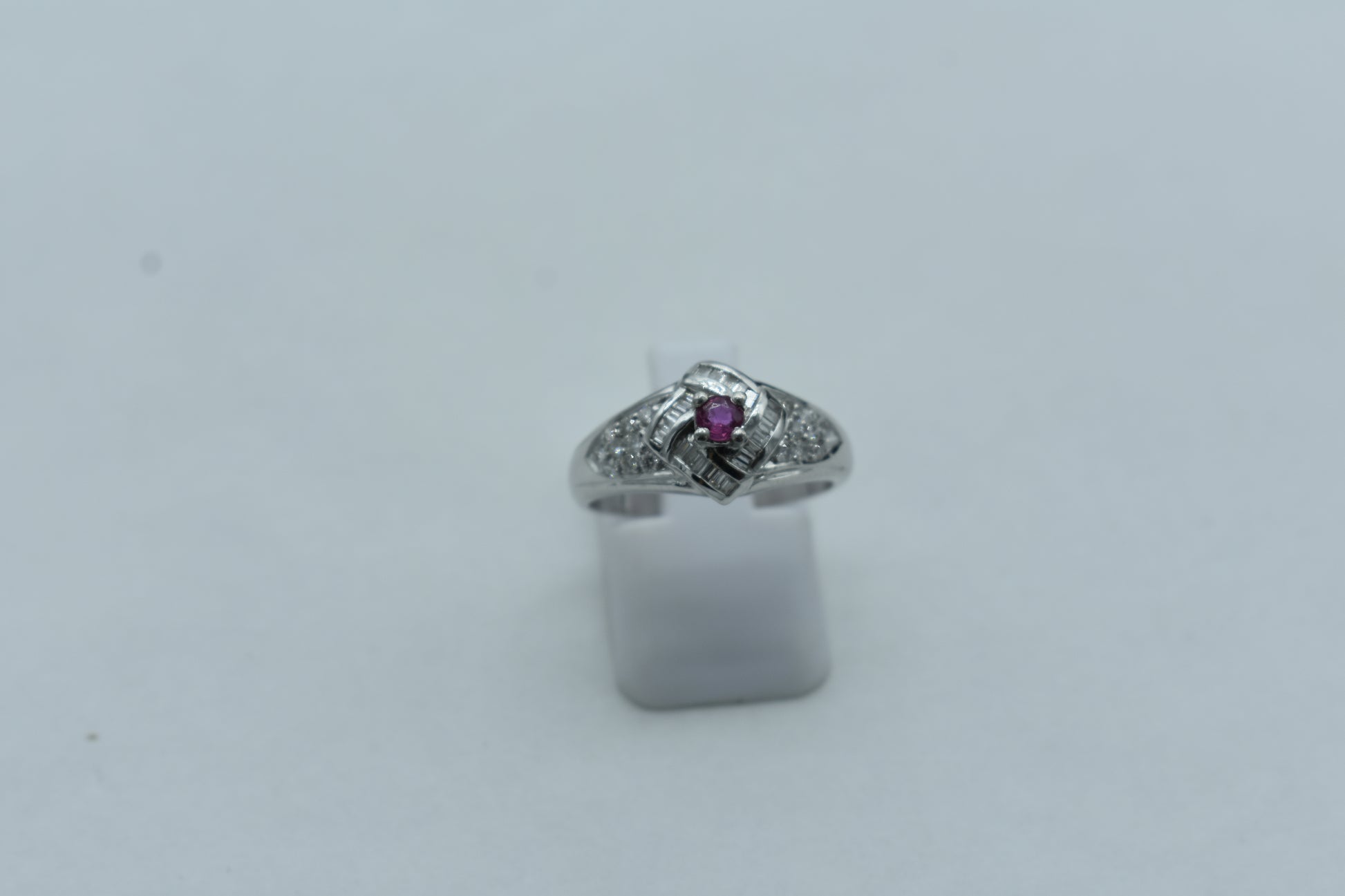 Anello di 4,40 grammi di oro bianco 750/1000 con 0,40 carati di diamanti e uno rubini di 0,16 carati. L'anello ha una misura di 14 cm