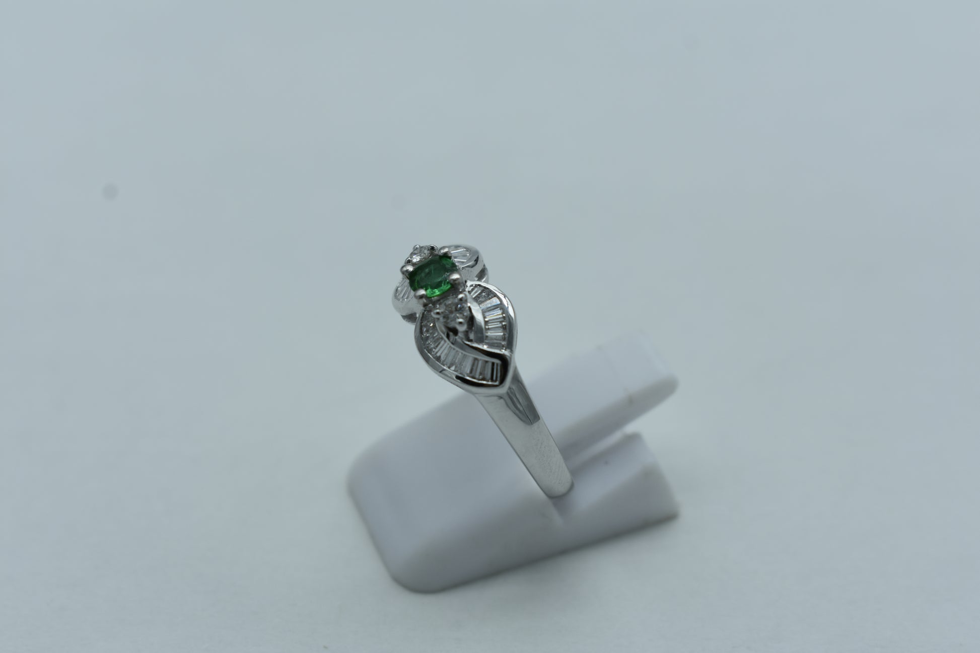Anello di 4,00 grammi di oro bianco 750/1000 con 0,40 carati di diamanti e uno smeraldo di 0,14 carati. L'anello ha una misura di 14 cm.