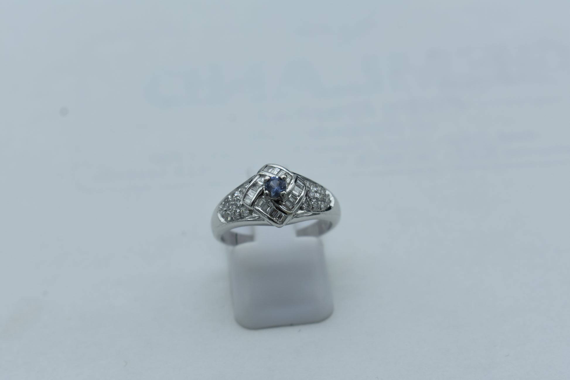 Anello di 4,30 grammi di oro bianco 750/1000 con 0,42 carati di diamanti e uno zaffiro di 0,16 carati. L'anello ha una misura di 14 cm