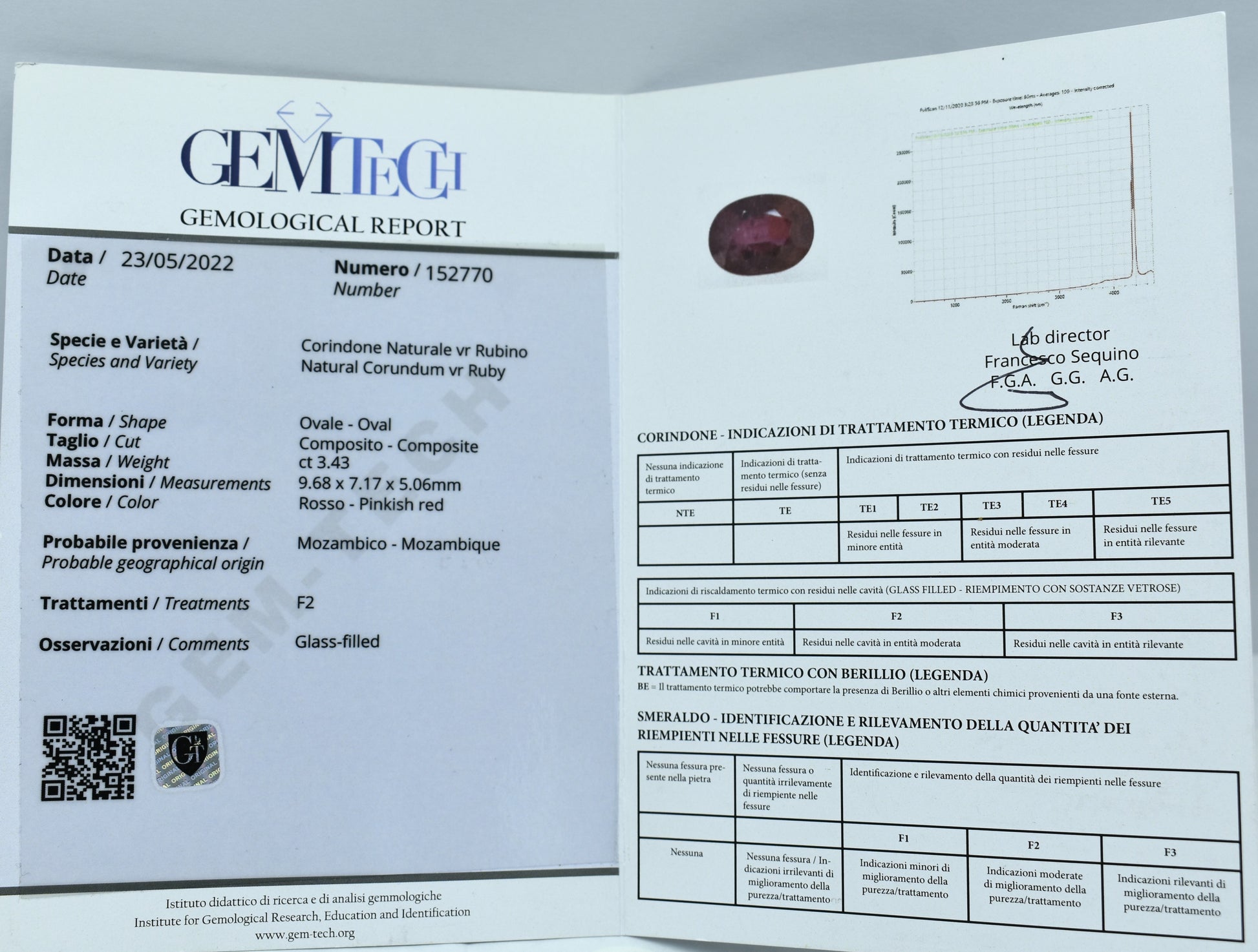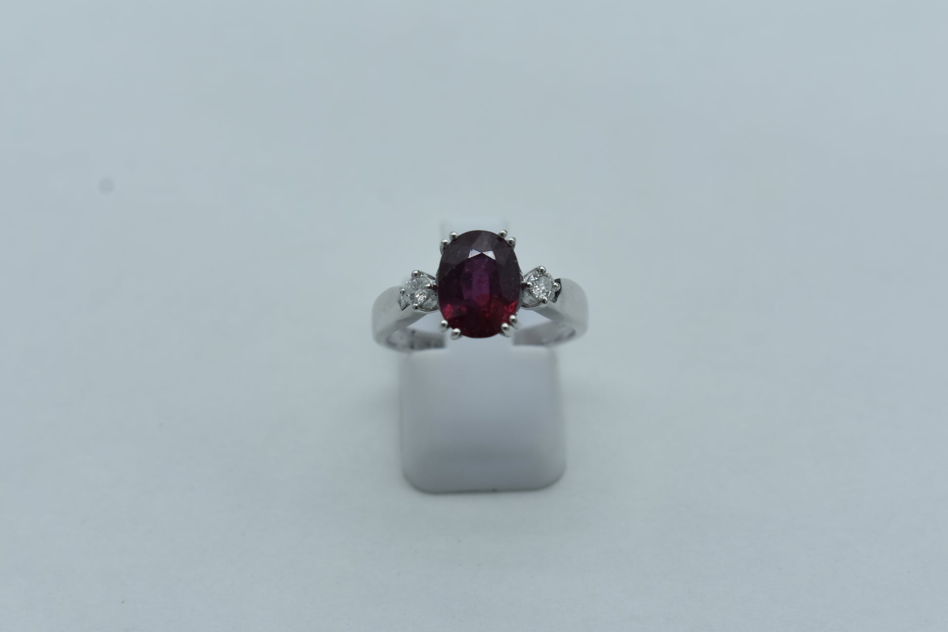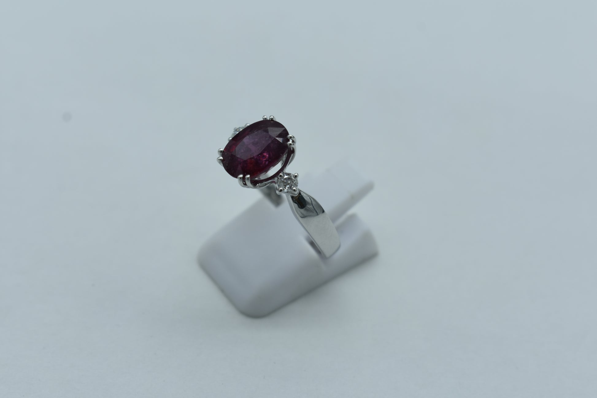 Anello di 3.80 grammi di oro bianco 750/1000 con 0,16 carati di diamanti e 3.43 carati di rubino certificato.