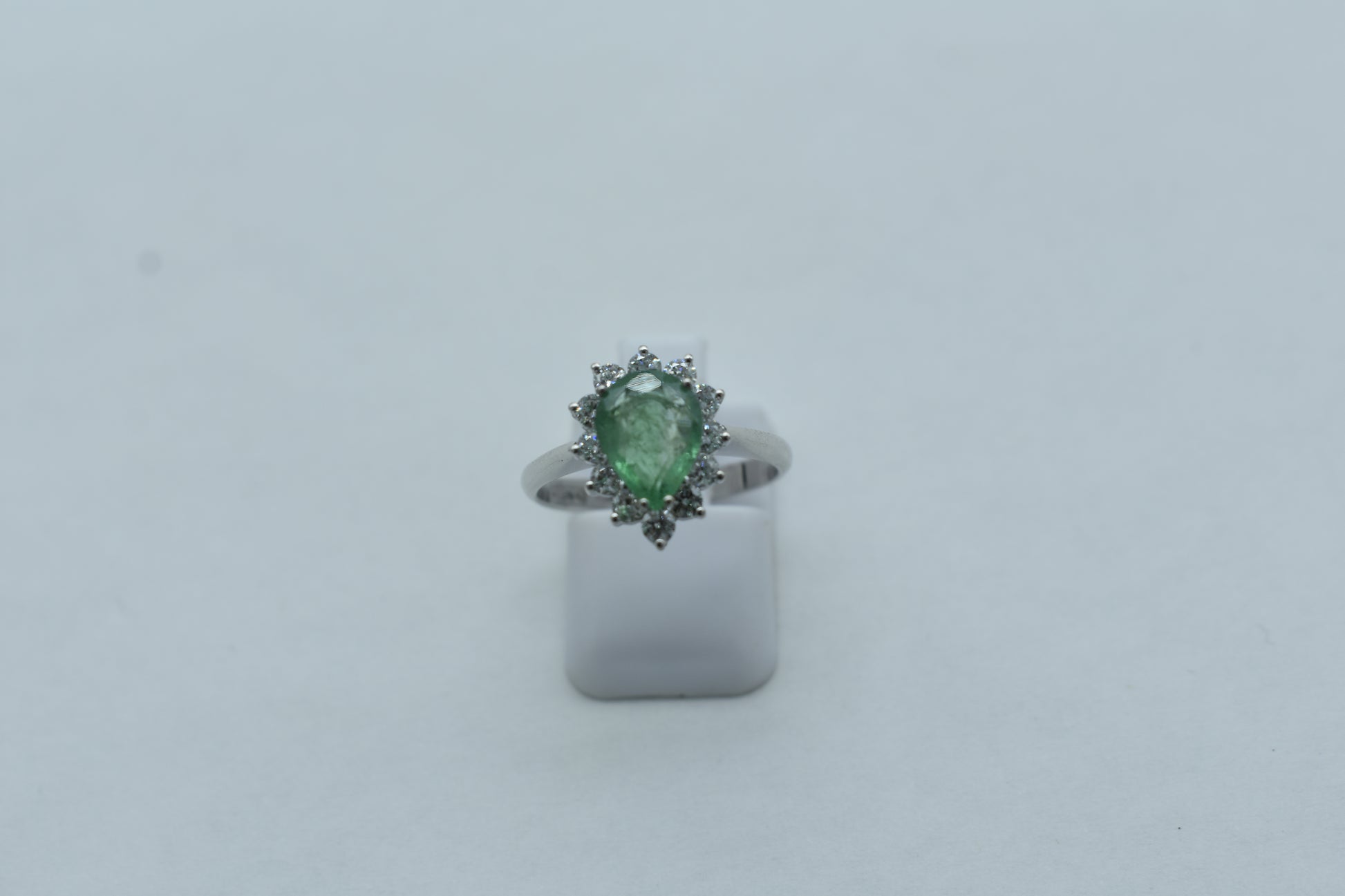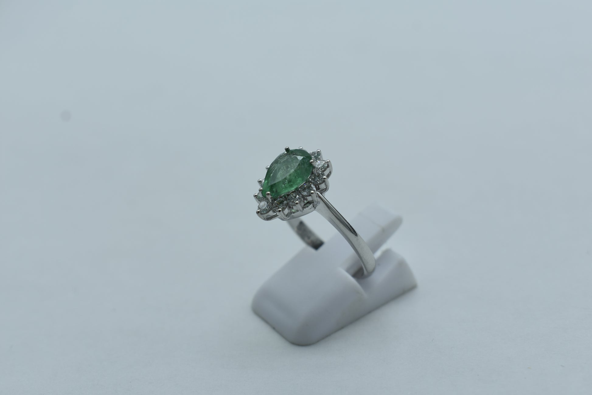 Anello di 4,30 grammi di oro bianco 750/1000 con 0,60 carati di diamanti e smeraldo centrale di 1,25 carati.