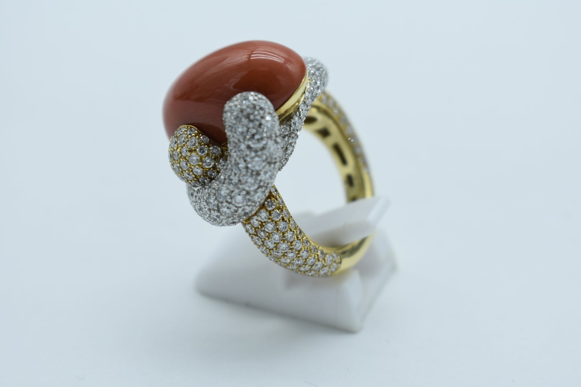 Anello di 19.00 grammi di oro giallo 750/1000 con 5.98 carati di diamanti e una spola di corallo di 5.35 grammi. L'anello ha una misura di 16 cm