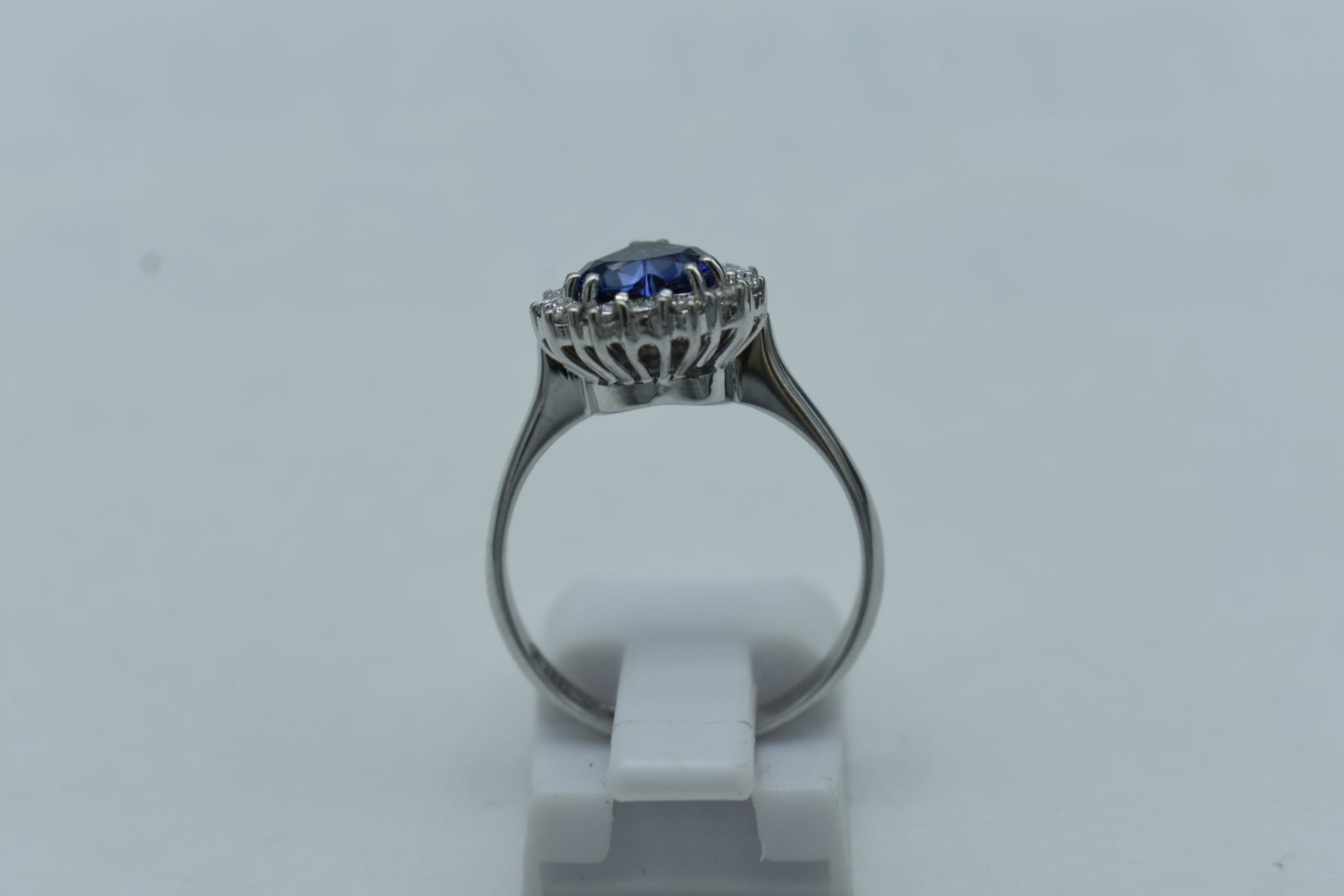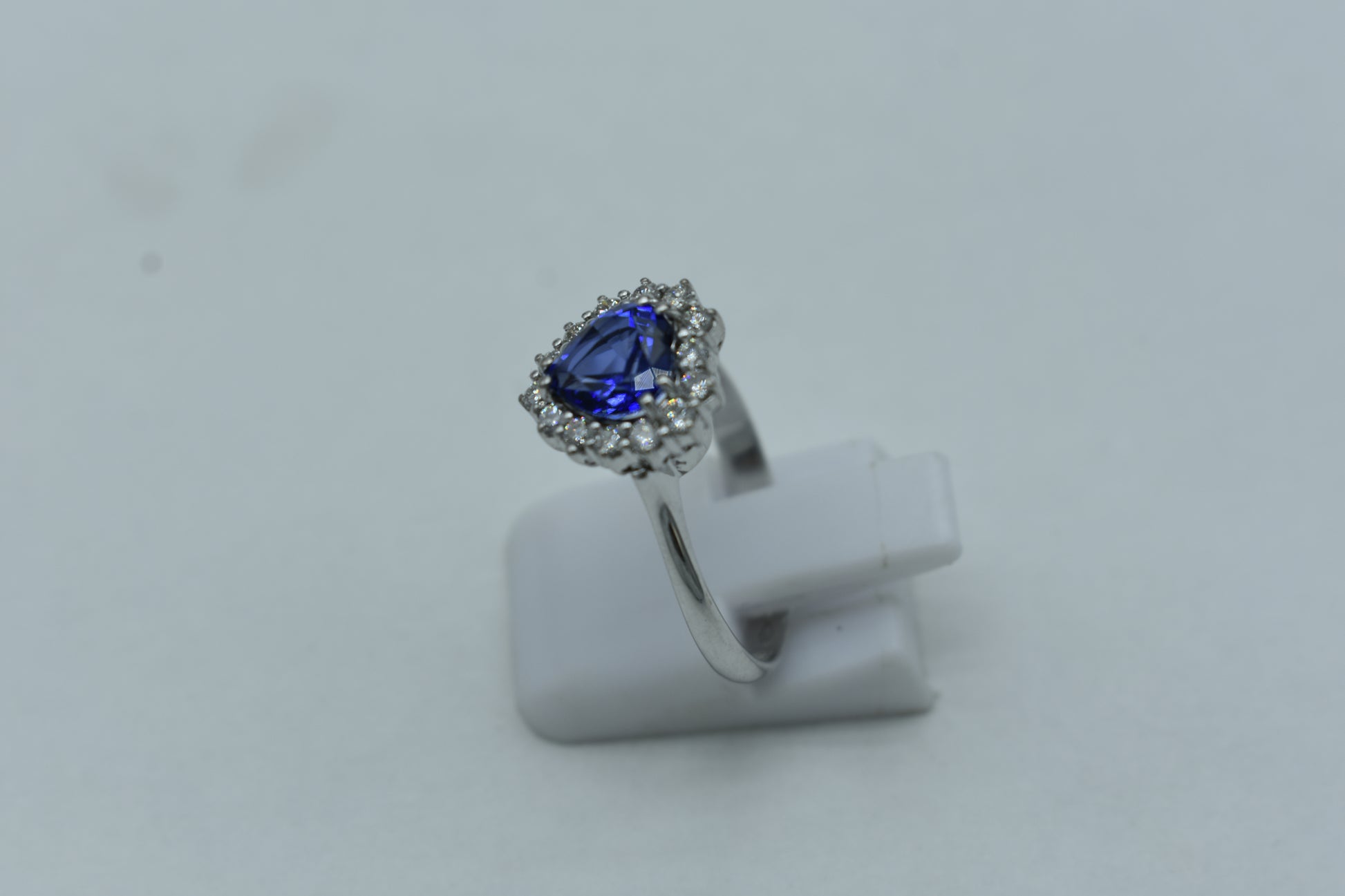 Anello di 4.20 grammi di oro bianco 750/1000 con 0.36 carati di diamanti e 1.45 carati di zaffiro taglio cuore