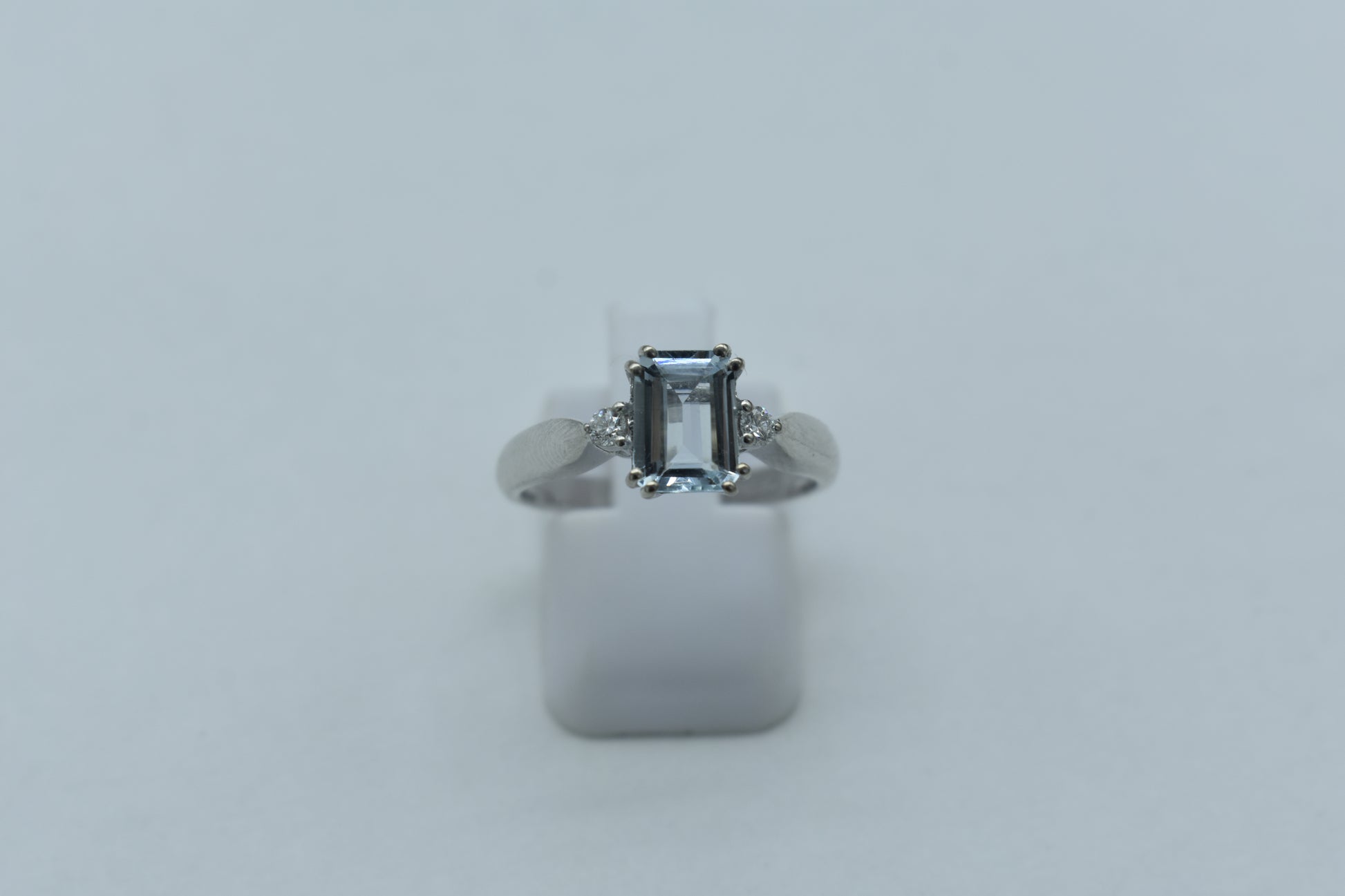 Anello di 4.50 grammi di oro bianco 750/1000 con 0.10 carati di diamanti taglio rotondo e centrale di acquamarina da 1.01 carati. L'anello ha una misura di 15 cm