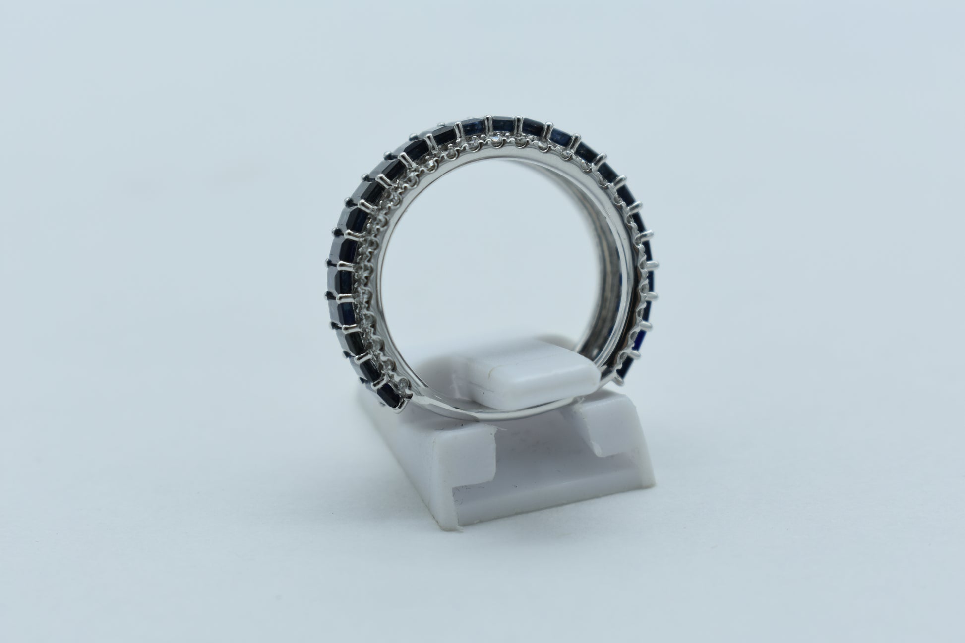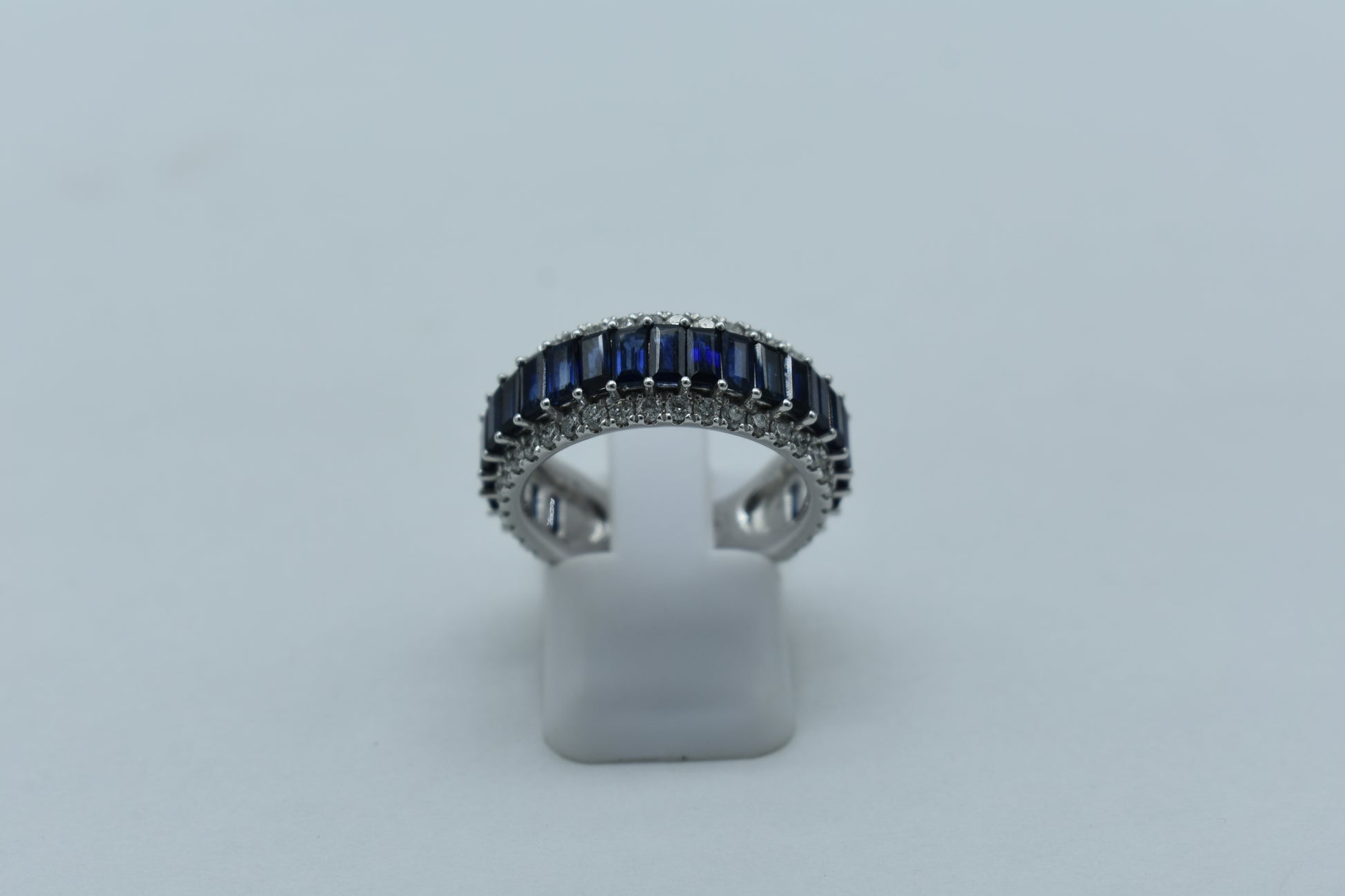 Anello di 5.40 grammi di oro bianco 750/1000 con 1.08 carati di diamanti e zaffiri di 4.36 carati. L'anello ha una misura di 14 cm