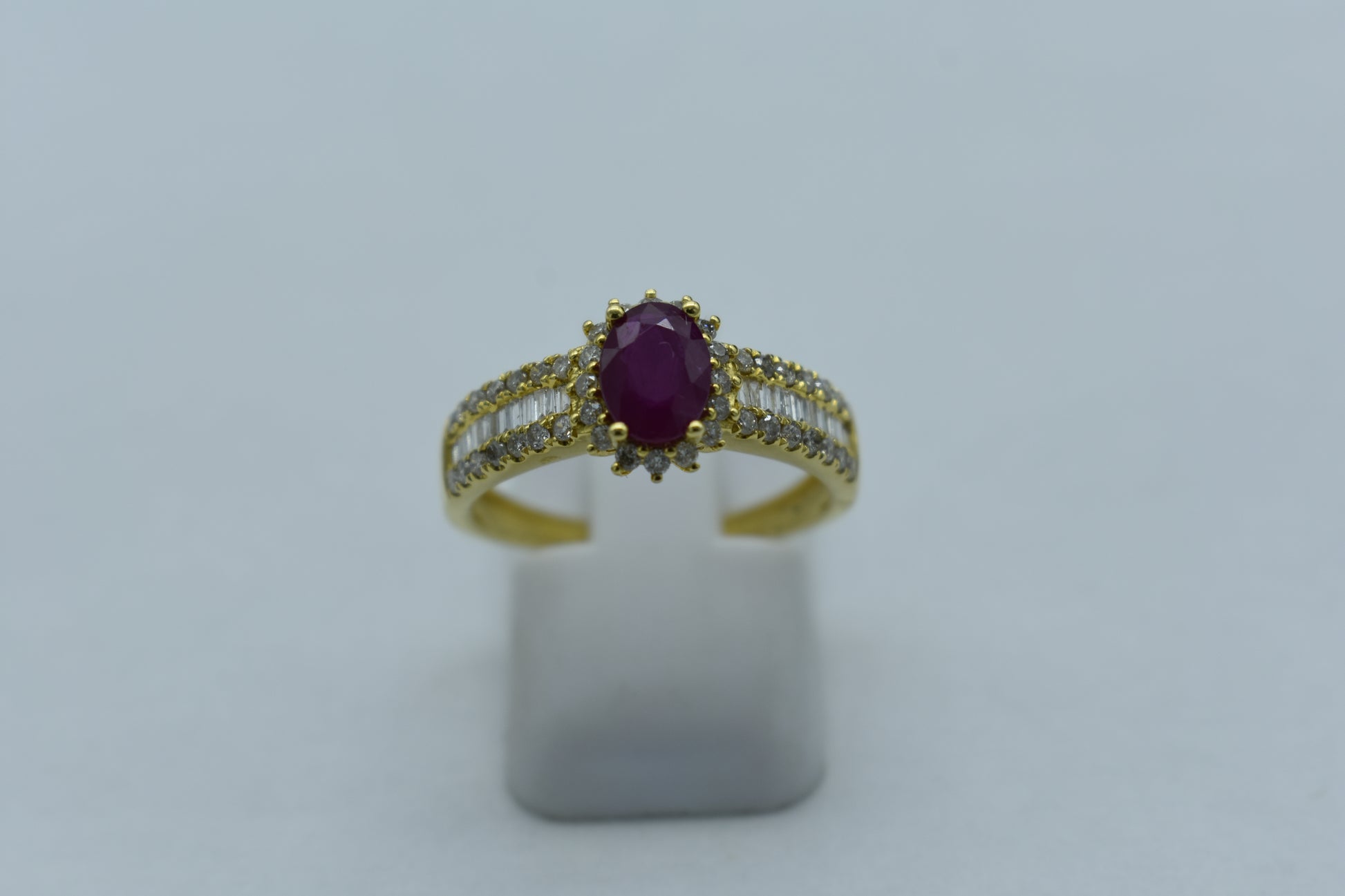 Anello di 2.60 grammi di oro giallo 750/1000 con 0.77 carati di diamanti taglio rotondo, 0.34 carati di diamanti taglio baguette con centrale di rubino da 1.09 carati. L'anello ha una misura di 14 cm