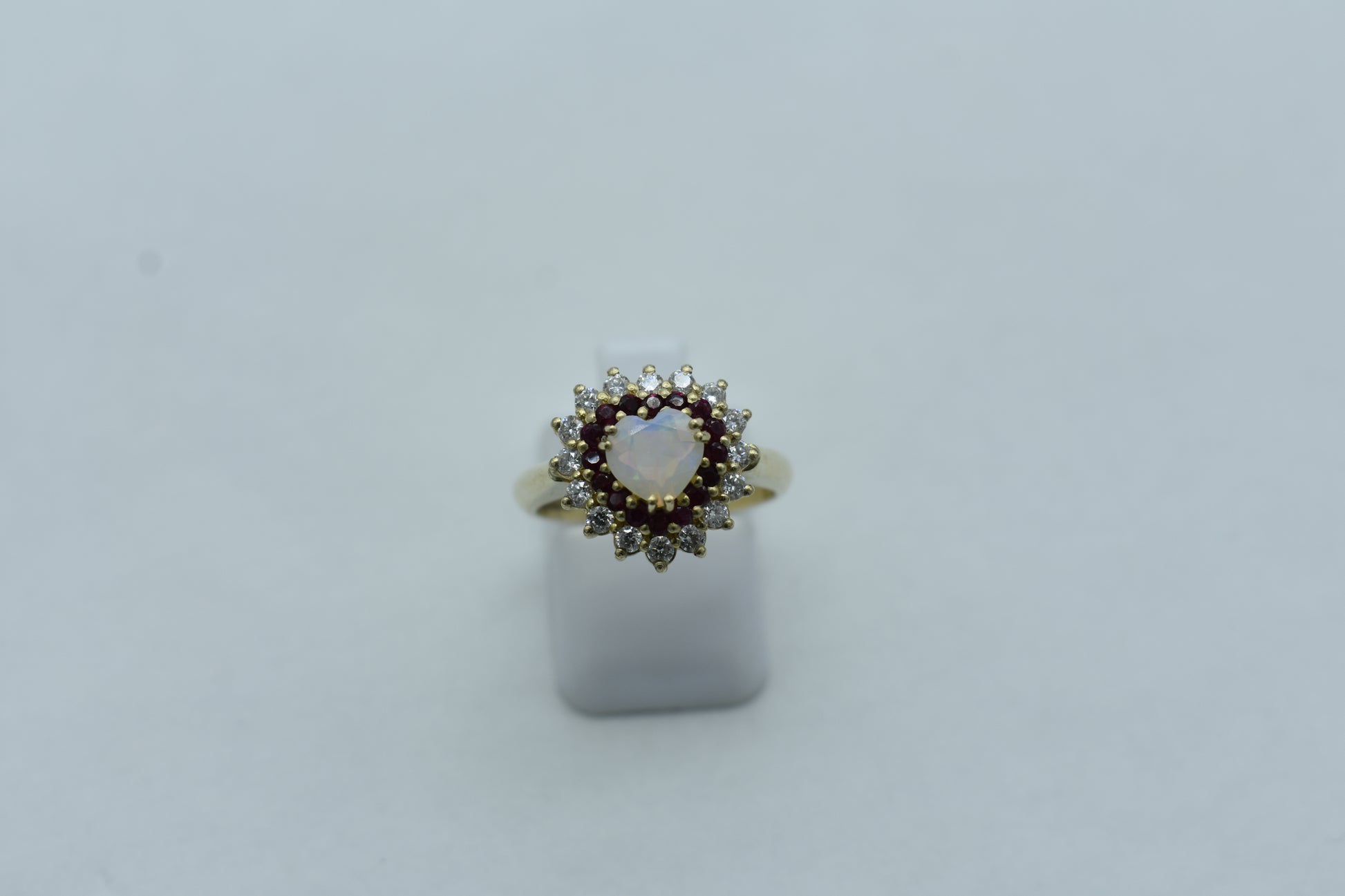 Anello di 5,20 grammi di oro giallo 375/1000 con 0,48 carati di diamanti, 0,48 rubini e opale centrale di 0,80 carati.
