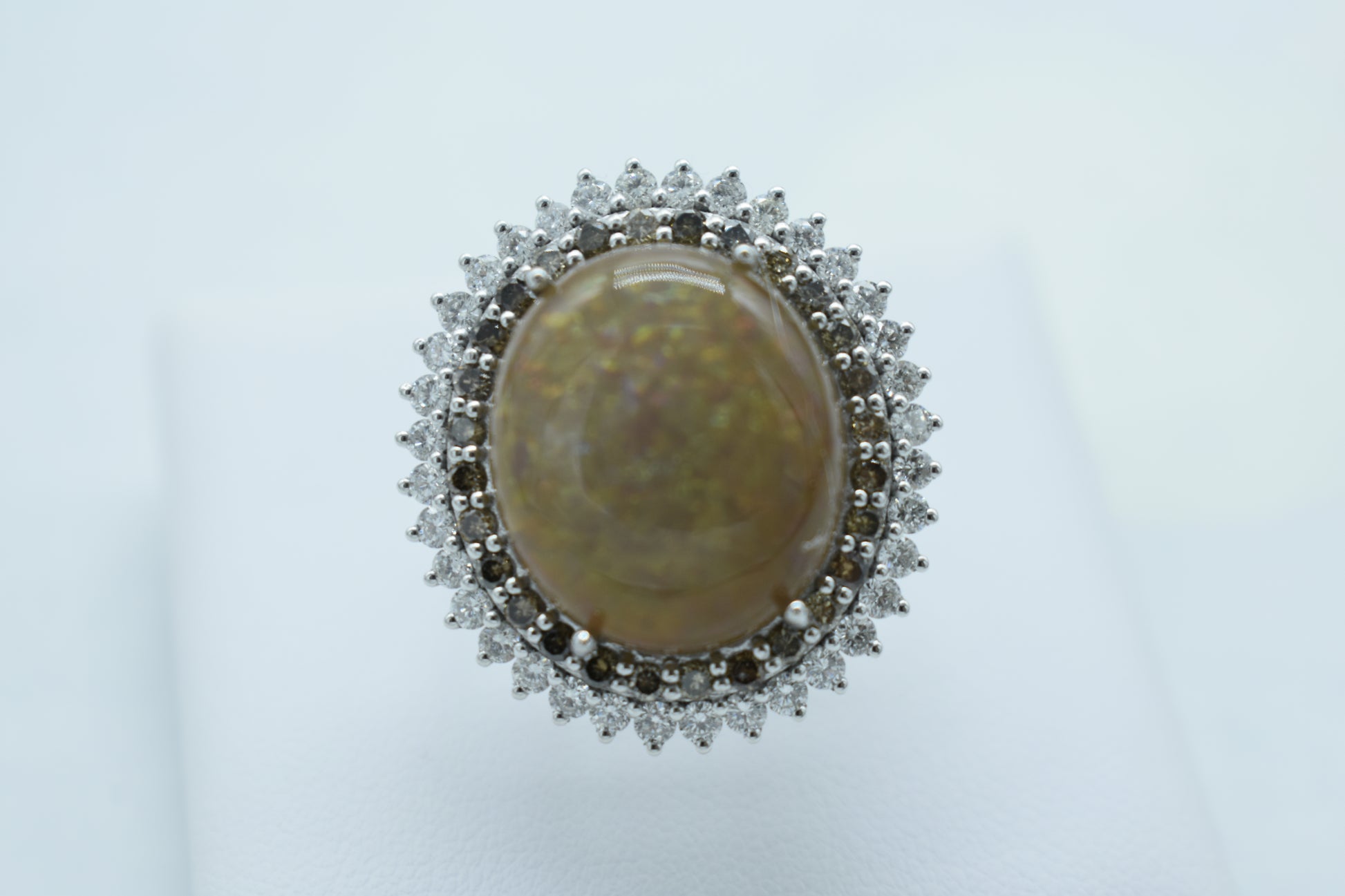 Anello di 12,2 grammi di oro bianco 750/1000 con 1.44 carati di diamanti bianchi, 1.12 di diamanti brown e opale di 16,20 carati
