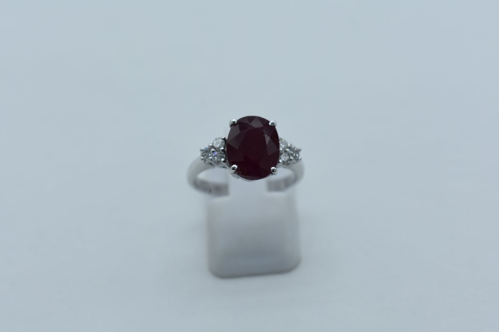 Anello di 3.70 grammi di oro bianco 750/1000 con 0.30 carati di diamanti e 4.43 carati di rubini. L'anello ha una misura di 13 cm