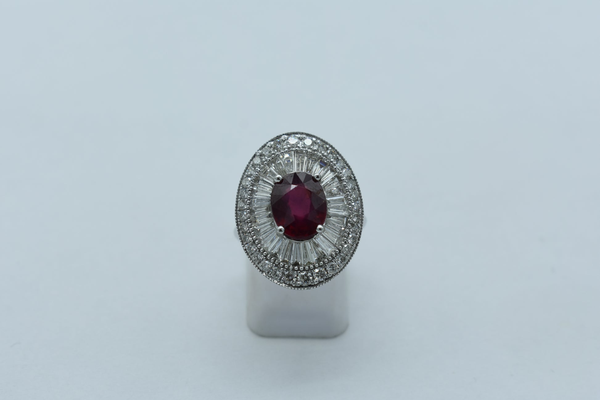 Anello di 5.70 grammi di oro bianco 750/1000 con 2.42 carati di diamanti e rubino centrale da 3.39 carati. L'anello ha una misura di 13 cm