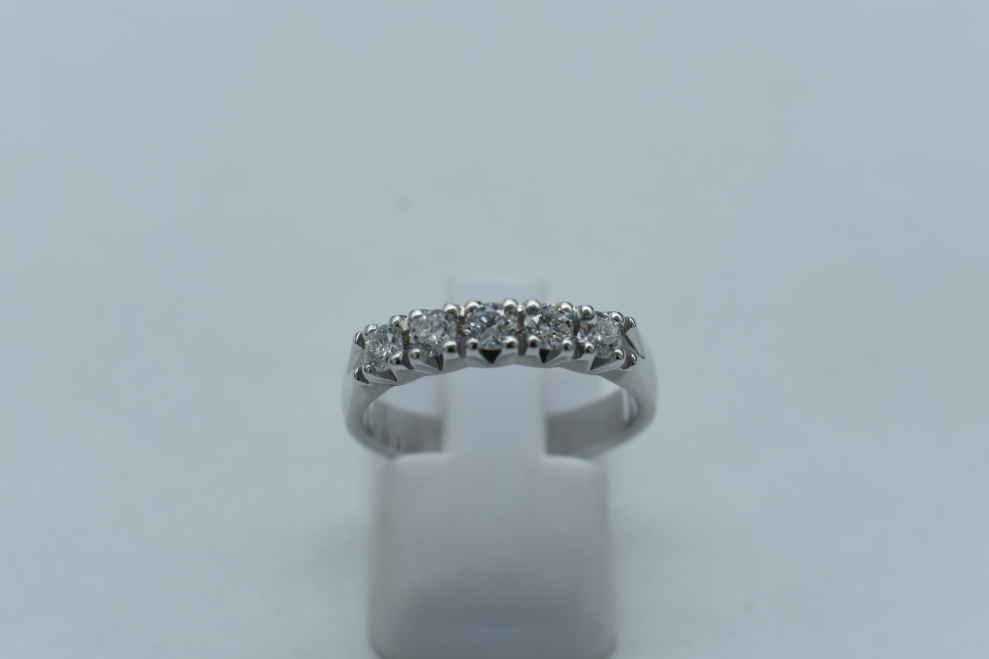 Veretta di 4,30 grammi di oro bianco 750/1000 con 0.55 carati di diamanti F color VVS L'anello ha una misura di 13 cm