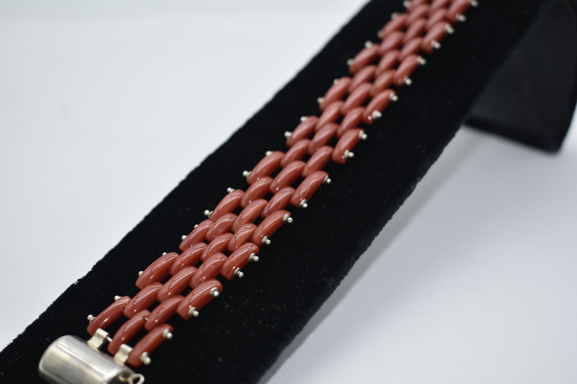 Bracciale con barrette di corallo Sardegna interamente fabbricata a mano da artigiani professionisti. L'oggetto ha una misura di 20 cm e un peso di 19,10 grammi