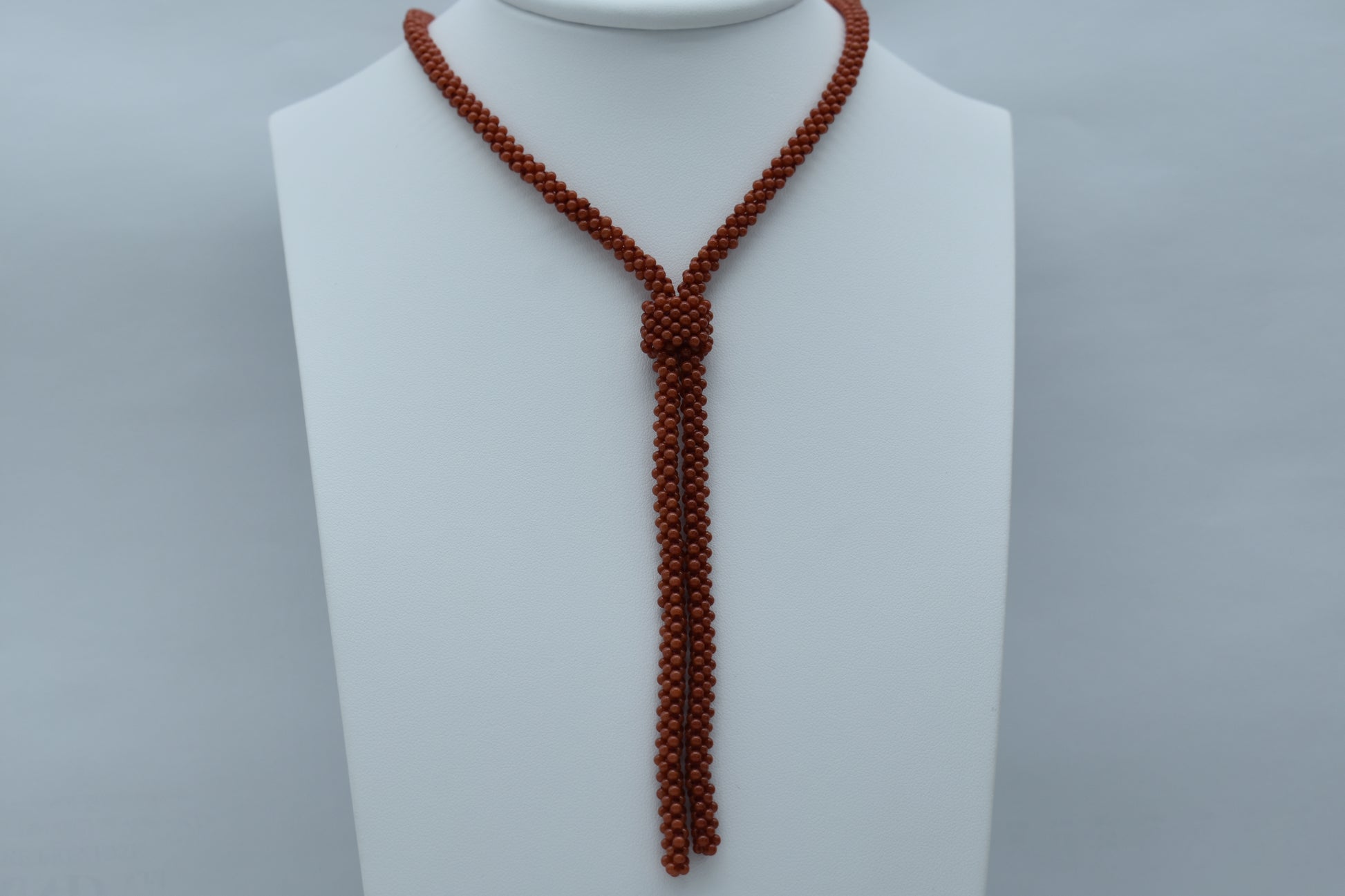 Collana tessito di corallo modello "saliscendi" interamente fabbricata a mano da artigiani professionisti. L'oggetto pesa 30.28 grammi.