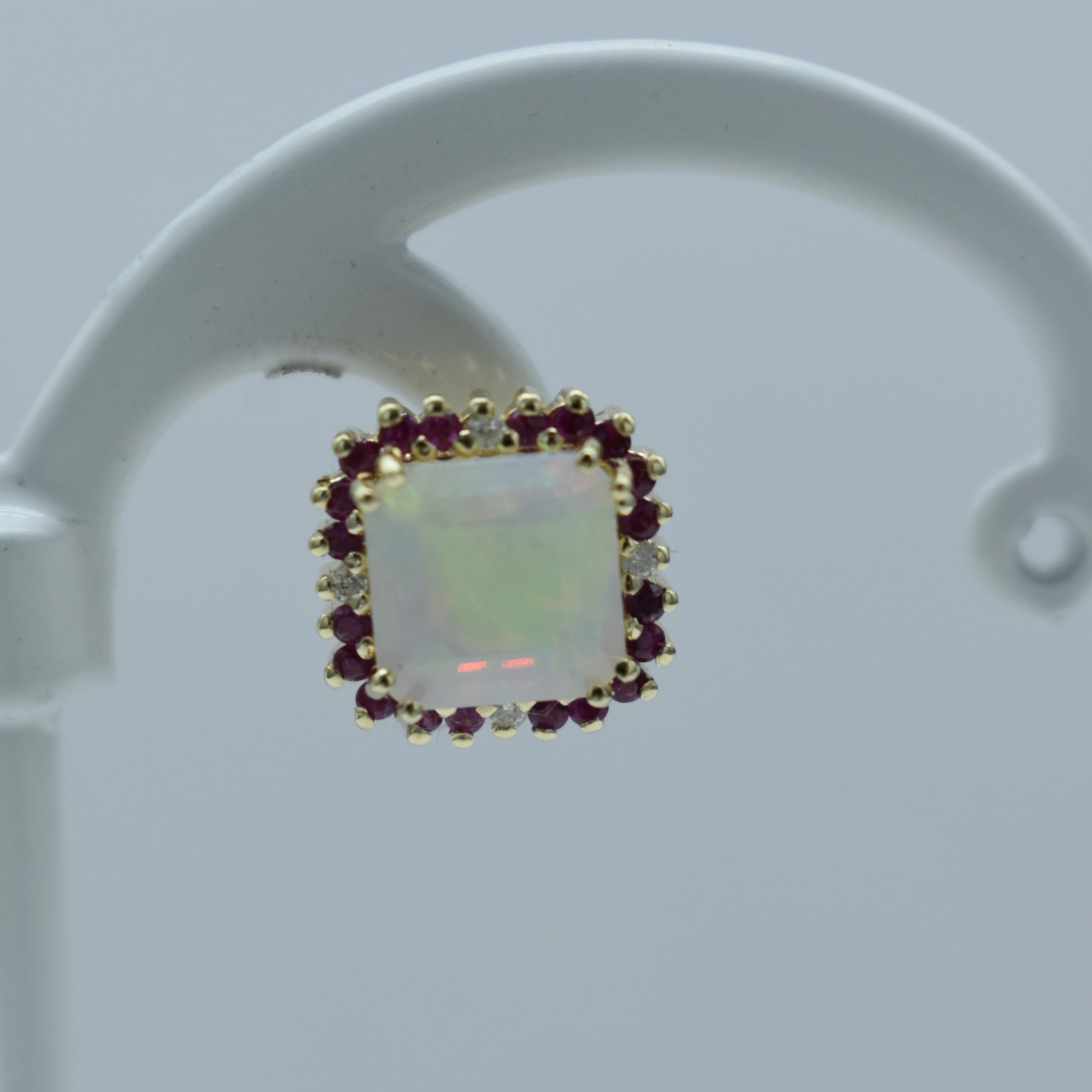 Orecchini di 4,20 grammi di oro giallo 375/1000 con 0,04 carati di diamanti, rubini 0,40 carati e opali centrali di 2,36 carati.
