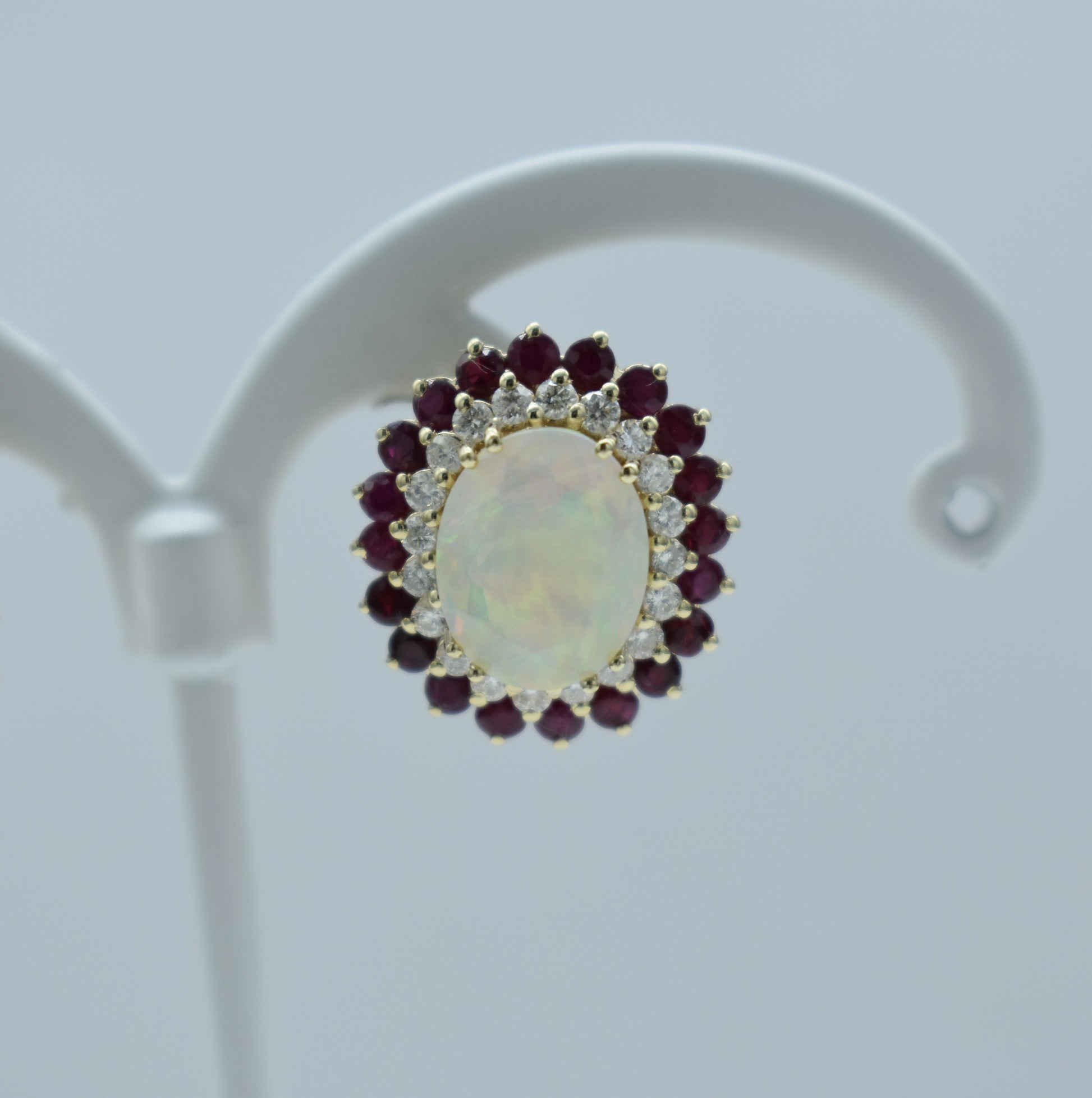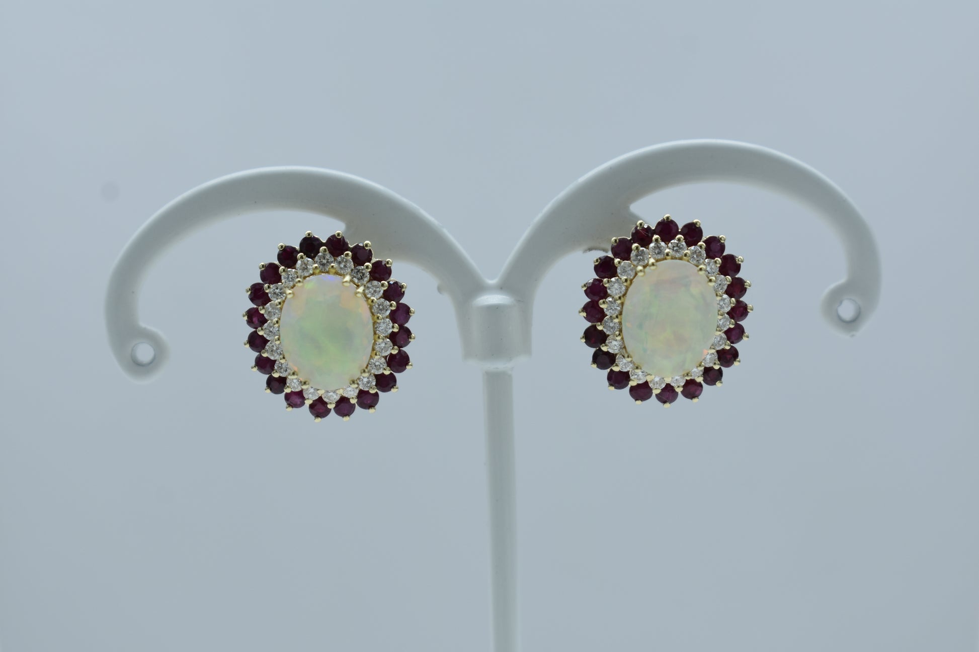 Orecchini di 5,60 grammi di oro giallo 375/1000 con 0,80 carati di diamanti, rubini 1,86 carati e opali centrali di 3,47 carati.