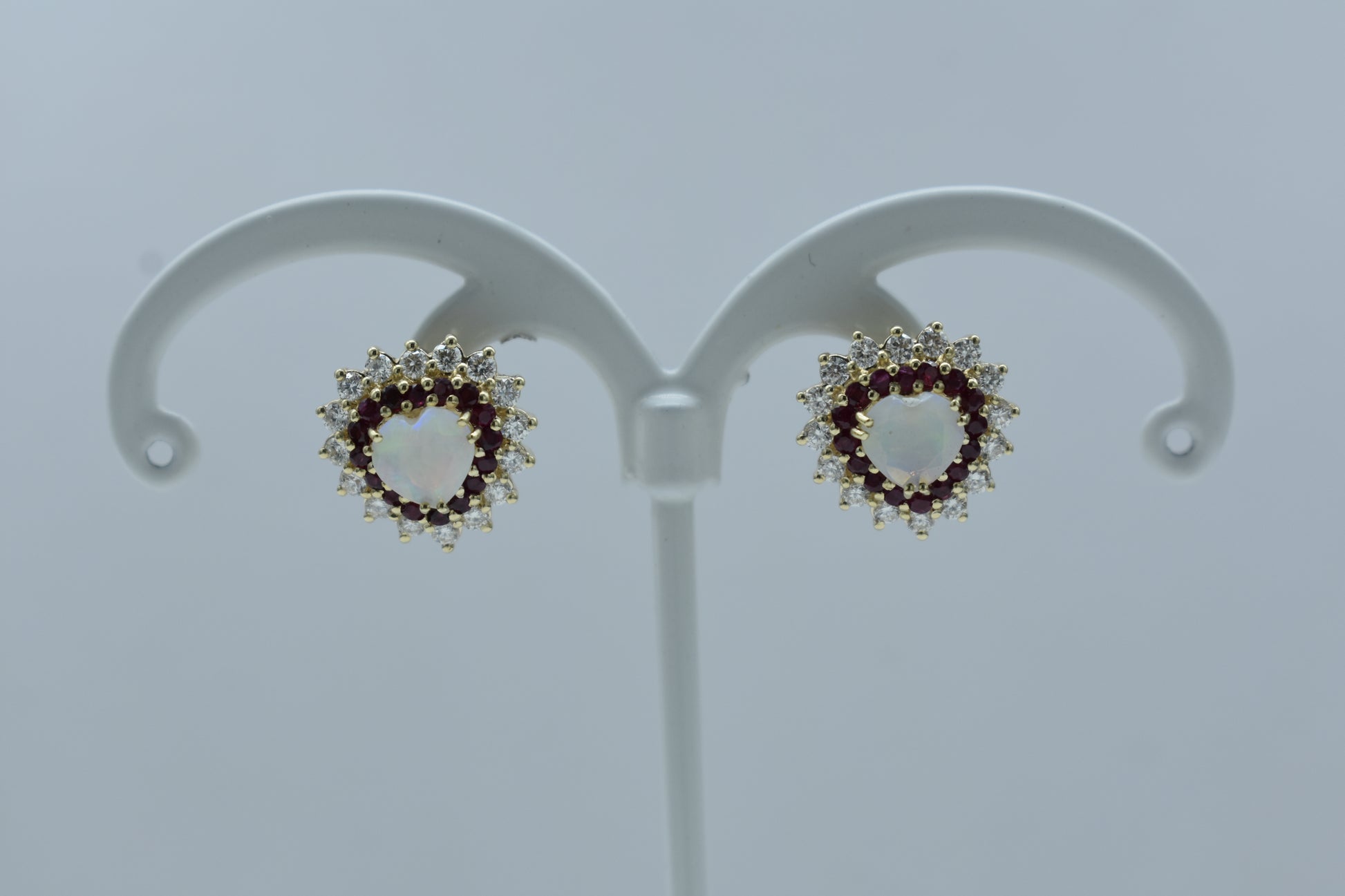 Orecchini di 5,20 grammi di oro giallo 375/1000 con 0,96 carati di diamanti, rubini 1,08 carati e opali centrali di 1,30 carati.