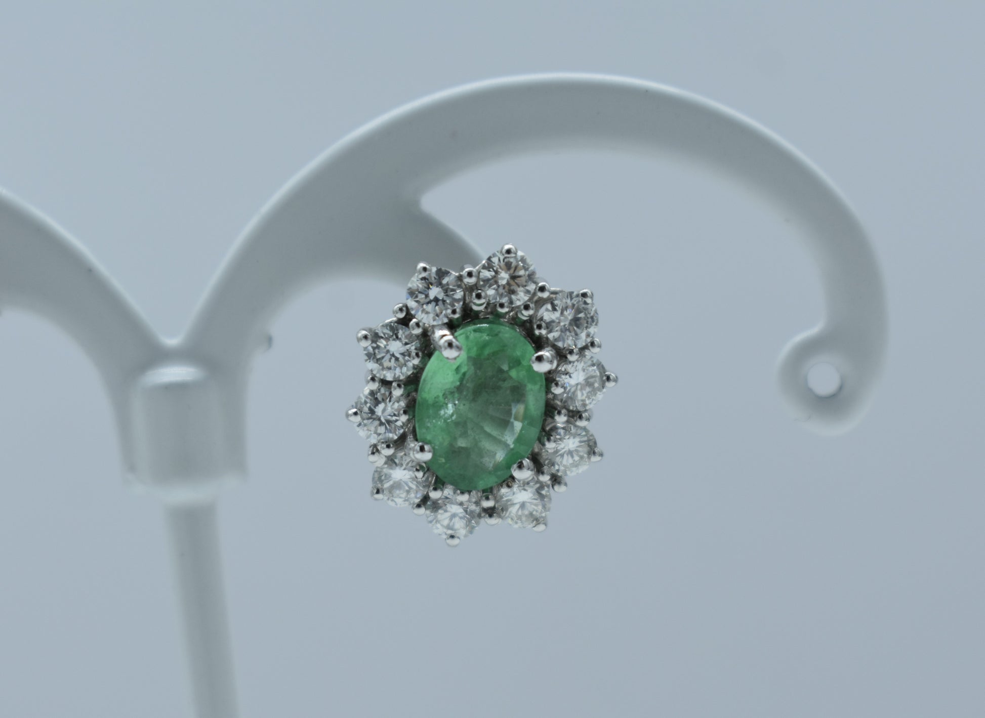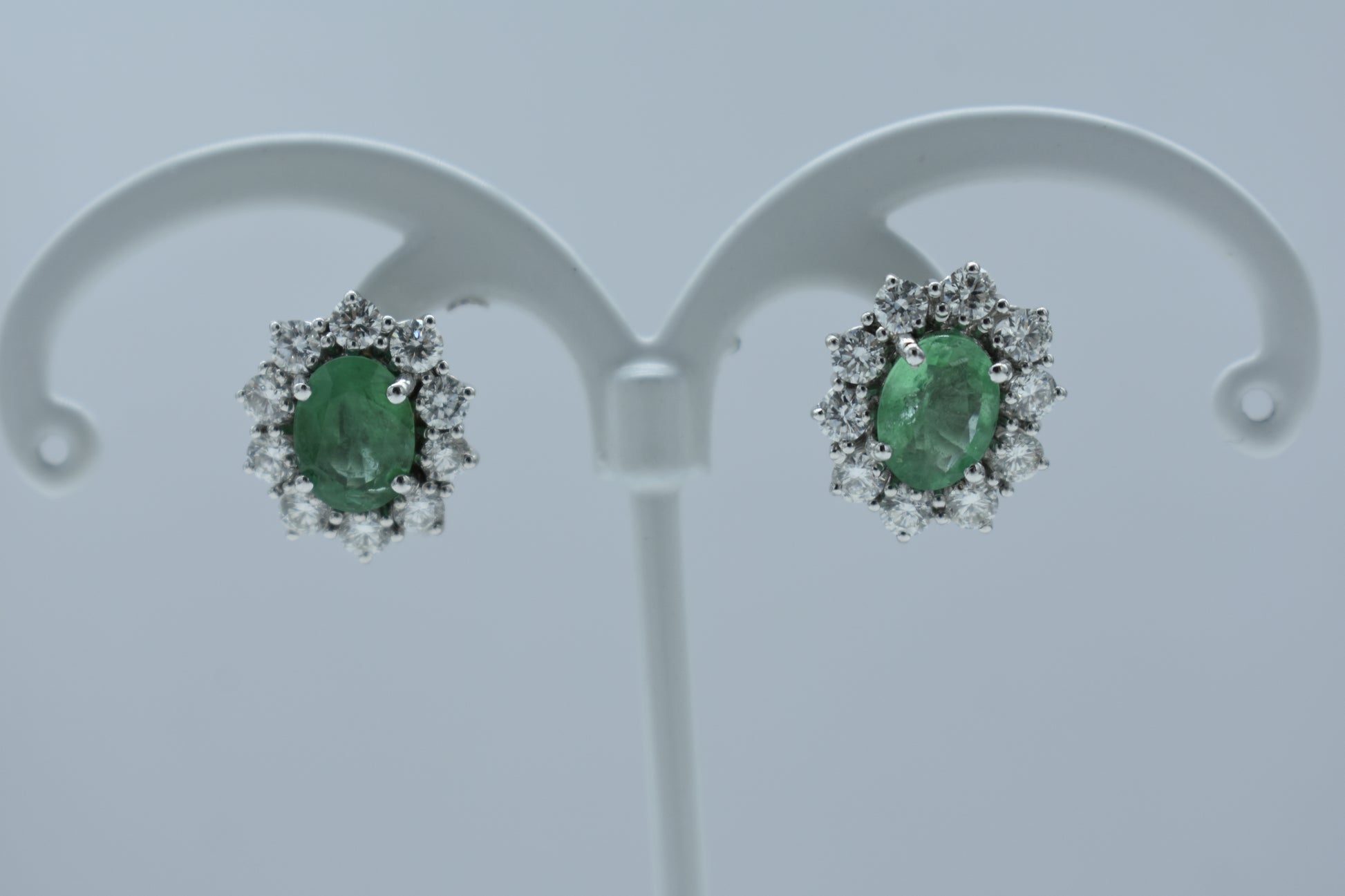 Orecchini di 5.40 grammi di oro bianco 750/1000 con 1.20 carati di diamanti e 3.26 carati di smeraldo