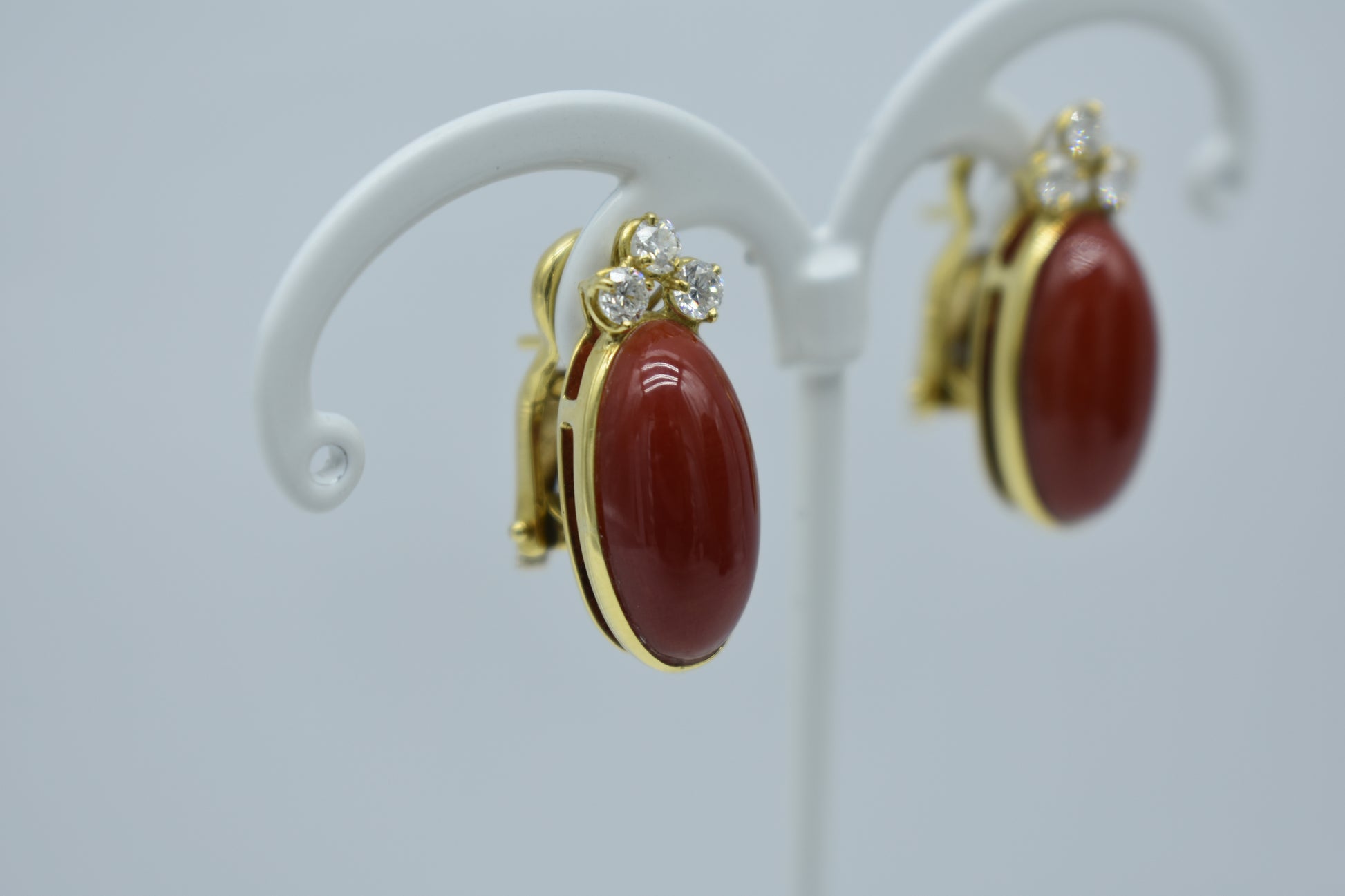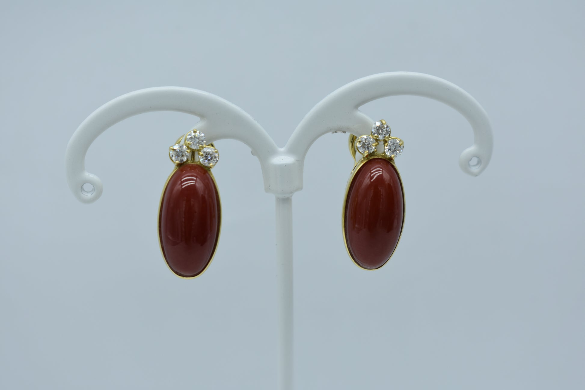Orecchini di 9.50 grammi di oro giallo 750/1000 con 0.32 carati di diamanti e 1.80 grammi di corallo